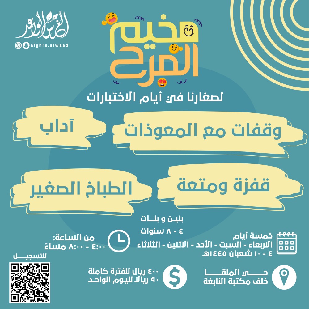 سعيًا لتهيئة أجواء مناسبة للأسر في أيام الاختبارات؛ نقدم لصغارنا: «مُخيّـم المـرح» ✨